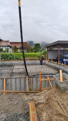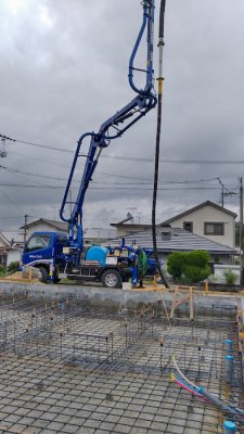 こんにちは! 工事進行担当の山下です。 8月も盆行事があったり、広島県は大雨洪水警報が続いたりと、ご心配な毎日が続いたと思います。 東広島市内の工事現場では、天候に負けず工程を調整しながら、確認に着々と進行しています!! 盆前には、基礎工事の鉄筋の組立ても終わり、鉄筋組立ての検査を受けたところです↓長い雨が続きましたが、曇の晴れ間にポンプ車を使って コンクリートを打ちました↓最近では、どこの工事中の現場でもポンプ車は目にしますが、昔は一輪車を押しながらたくさん 職人さんを入れて工事を行ってましたが、少人数で確実に短時間でコンクリートが打てるので、 コンクリートの品質強度が保てます! 基礎工事が進むと、次はメインの大工さんの工事がスタートします❕❕ 次回は、大工さんのお仕事も紹介させていただきます♪