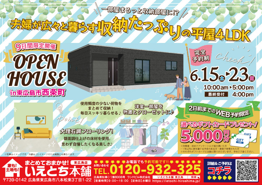 | 場所 | 【東広島市西条町】開催地はお施主様の個人情報保護のため見学会に予約された方にのみご連絡させていただきます。 |